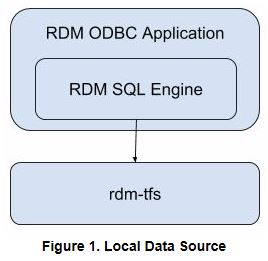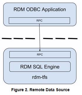 Alternatively, an SQL API application can use its RPC mechanism to connect to a remote rdm-tfs which has its own built-in RDM SQL Engine to process the application's requests (Figure 2). This is a client/server configuration that allows multiple SQL API applications, including third-party ODBC tools, to simultaneously access a single rdm-tfs.