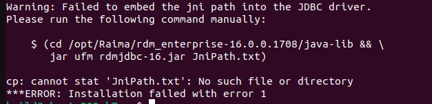 The installation is complete when this error is displayed except for the JNI path modification. A "readme" file is generated in the current working directory with the instructions needed to complete the JNI setup after the Java JDK is installed (README-JniPath.txt).