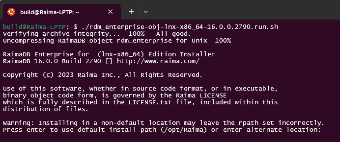 The installer will create the directory rdm_<package>-16.0 within the directory specified. We recommend that you use the default (/opt/Raima/rdm-<package>-16.0/) because all binaries have the path to the libraries embedded into them.