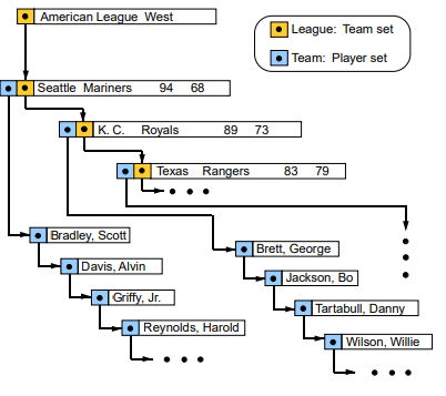 The illustration below shows the set relationships for the baseball example. The boxes represent instances of the league, team, and player record types. The arrows represent the links that connect the related records.